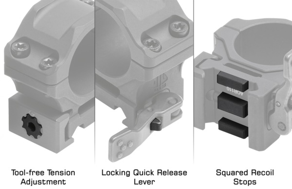 Ринговете за опитка UTG ACCU-SYNC 1″ QR Picatinny Scope Rings, Low Profile са обработени прецизно на CNC от алуминий 6061-T6 и завършени с матова черна анодизация. Олекотените елементи намаляват общото тегло, без да намаляват издръжливостта. Всички остри ръбове и ъгли са отстранени и заоблени. Монтажът за бързо освобождаване (QR) е снабден с безинструментно регулиране на натягането, заключващ лост за бързо освобождаване и квадратни ограничители на отката за сигурно задържане на нулата и връщане към нулата. Височина на седлото е 10 мм, централна височина 22.7 мм, подходяща за 1 инч тръба с външен диаметър на обектива до 45 мм.