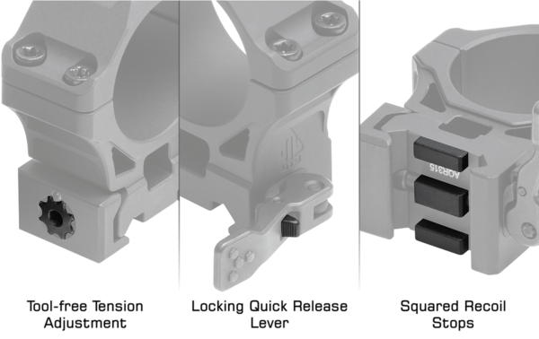 Ринговете за опитка UTG ACCU-SYNC 30 mm QR Picatinny Scope Rings, Medium Profile са обработени прецизно на CNC от алуминий 6061-T6 и завършени с матова черна анодизация. Олекотените елементи намаляват общото тегло, без да намаляват издръжливостта. Всички остри ръбове и ъгли са отстранени и заоблени. Монтажът за бързо освобождаване (QR) е снабден с безинструментно регулиране на натягането, заключващ лост за бързо освобождаване и квадратни ограничители на отката за сигурно задържане на нулата и връщане към нулата. Височина на седлото е 15 мм, централна височина 30 мм, подходяща за 30-милиметрова тръба с външен диаметър на обектива до 60 мм. ЗАБЕЛЕЖКА: Препоръчваме да затягате винтовете на горния пръстен с въртящ момент от 2,8 Nm.