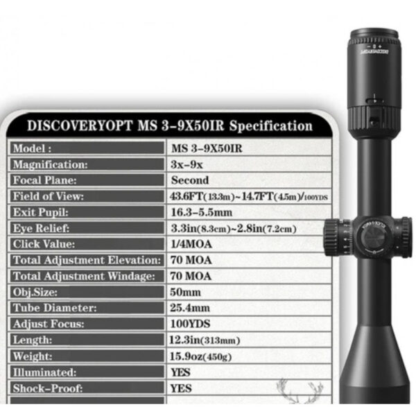 Oптиката Discovery Optics MS 3-9X50IR е с FMC лещи с многослойно покритие. голямо зрително поле и изключителна надеждност. Подсветка на скалата с няколко степени. Паралакс на обектива фиксиран на 100 ярда. Регулируем диоптър. VCF оптична система лещи с многослойно FMC покритие. С голяма устойчивост на откат-може да се използва на PCP въздушни пушки до 150j. Корекции от 1/4MOA за прецизна прострелка. Части обработени с CNC, надеждни и точни. Корпусът е изработен от единично парче авиационен алуминий и азотонапълнен. В комплект с кърпичка за почистване, книжка и предпазни капачки на обектива и окуляра.