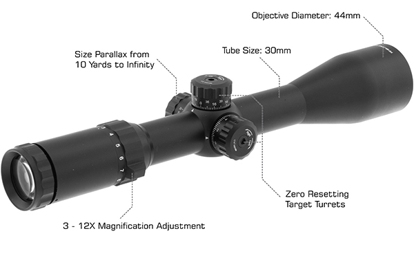 Оптиката Leapers UTG® Classic 3-12X44 30mm Mil-dot Scopeе с диаметър на тубуса 30мм, настройка на паралакс, точна и много здрава, подходяща за стрелба на близко и средно разстояние с Mil Dot скала. Лещите предлагат ясни и контрастни образи дори при слаба светлина. Здрава и водоустойчива. Включени в комплекта капачки и сенник.