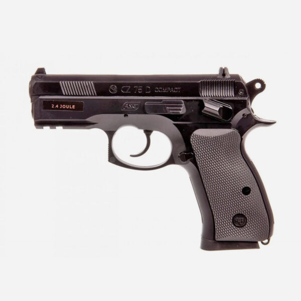 Еърсофт пистолетът ASG CZ 75 D Compact, CO2, Non Blow Back 6мм е най-вярното въздушно копие на CZ-75 D Compact. За по-голяма автентичност този пистолета е снабден с оригинално лого на Чешката оръжейница. Вероятно най-големият плюс при този пистолет е перфектно оформената ръкохватка с гумирани части, наистина удобен и приятен захват на пистолета. В пълнителя на въздушния пистолет се поставят 12-грамови CO2 и стоманени BB сачми. Със системата Double Action спестявате много време, тъй като не е необходимо да натискате чукчето за първи път. Предпазителят срещу случайно изстрелване на пистолета е разположен над ръкохватката непосредствено до чукчето. На пистолета има и 22-милиметрова релса за свързване на лазер или фенерче. Стрелците ще останат доволни и от сравнително големия капацитет на пълнителя – 16 пластмасови BB 6 мм. Въздушният пистолет ASG CZ-75 D Compact е идеален за хоби стрелба.