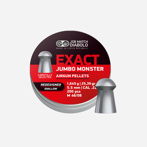 Чашките JSB Jumbo Monster Redesigned SHALLOW 5,52/200 1,645гр са с максимална прецизност на достъпна цена. Това е характерно за JSB diabolos. Изстрелвани от световни шампиони, препоръчвани от световни шампиони. Най-добрият тип за стрелба по полеви мишени.