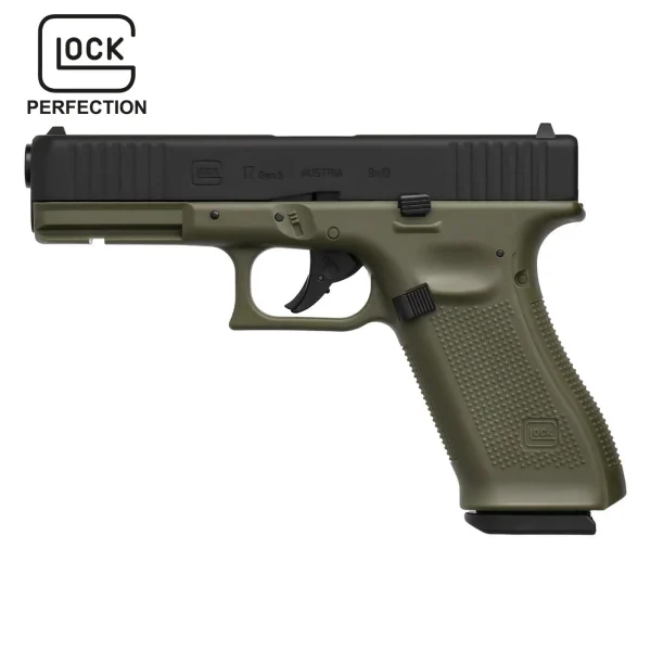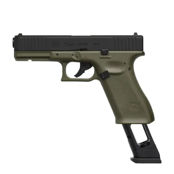 Еърсофт пистолета GLOCK 17 Gen5 (CO2 ) airsoft gun 6мм BB Battlefield Green със своята военно зелена рамка, черен плъзгач и черни функционални елементи, е впечатляващо оръжие в областта на еърсофта. По време на стрелбата на еърсофт състезание версията на GLOCK 17 Gen5 с CO₂ показва сходството си с оригинала. Типичните характеристики на Gen5 включват предни назъбвания, релса Weaver и предпазител на спусъка. Плъзгачът от тежък метал и мощният удар осигуряват автентично изживяване. Всеки изстрел, произведен от пълнителя All-in-One с 14 патрона, води до убедителен откат. Прецизните размери и реалистичното тегло гарантират перфектно боравене и пълна съвместимост със стандартни аксесоари като кобури.
