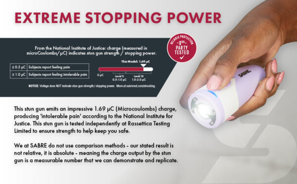 Бъдете в безопасност с електрошоковия пистолет Sabre 3-в-1 с лична аларма и фенерче (S-1015-LV). Със заряд от 1,69 mC, този пистолет Sabre Stun Gun е мощен, причинява „непоносима болка“ и ви дава сила с изключителна спираща сила, когато имате най-голяма нужда от нея. Персоналната аларма от 130 dB помага за предупреждение за помощ до 1475 фута (450 метра). Включва LED фенерче със 130 лумена с 3 различни режима на осветяване (високо, слабо, светлинно) осветява пътя ви в тъмното, като ви помага да изпълнявате ежедневни задачи като разходка на кучето или справяне с неочаквани спешни случаи, включително прекъсвания на електрозахранването. За максимално удобство този електрошок има калъф за безопасно съхранение и лесно пренасяне, включва кабел за зареждане от USB-B към USB-C, спестявайки разходите и времето за смяна на батерията. Чувствайте се уверени, като използвате вашия електрошоков пистолет със светлинния индикатор за захранване на батерията, който ви уведомява, когато е включен, и състоянието му на зареждане.